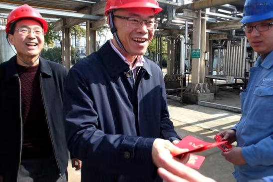 張萬順深入中控室、配電室、生產(chǎn)車間、環(huán)氧卸車平臺、污水處理站。每到一處,他都與員工一一親切握手,“同志們辛苦了”,“給大家拜年了”,一聲聲問候,一句句祝福,溫暖了堅守一線的每一位員工。