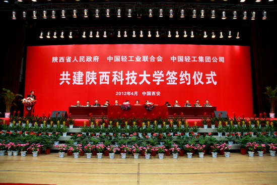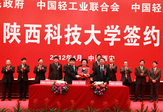 2012417日,陜西省人民政府與中國輕工業(yè)聯(lián)合會、中國輕工集團公司共建陜西科技大學簽約儀式在陜西科技大學隆重舉行。集團公司董事長、黨委書記陳鄂生出席簽約儀式,并代表集團公司與陜西省朱靜芝副省長、中國輕工業(yè)聯(lián)合會步正發(fā)會長簽署共建協(xié)議。