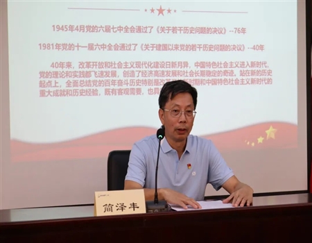 簡澤豐書記以“以史為鑒、開創(chuàng)未來、實(shí)干擔(dān)當(dāng)、勇毅前行”為主題講授了黨的十九屆六中全會(huì)精神專題黨課,從十個(gè)方面進(jìn)行“數(shù)字化”提煉,帶領(lǐng)全體黨員再次學(xué)習(xí)了黨的十九屆六中全會(huì)精神。